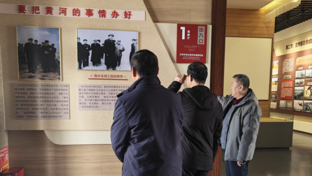 在兰考东坝头黄河毛主席纪念亭,研究院老师瞻仰了这座为纪念1952年毛主席视察黄河而建的纪念亭,见证着“要把黄河的事情办好”的世纪号召。站在纪念亭凭栏远眺,黄河在此处由东西流向转为南北,形成“豆腐腰”最险段。当年毛主席视察时指出‘黄河涨上天怎么办’,如今通过加固堤防、修建蓄滞洪区、完善水文监测体系等综合措施,已将防洪标准提升至200年一遇。团队实地查看了东坝头险工段的石坝、垛、护岸、埽工等水利设施展览,一张张泛黄的电报、一份份治黄规划图,诉说着“一张蓝图绘到底”的治黄传承和群众治河智慧。